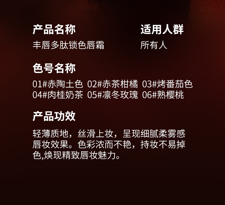 - 功效 : 修飾唇部,美化嘴唇